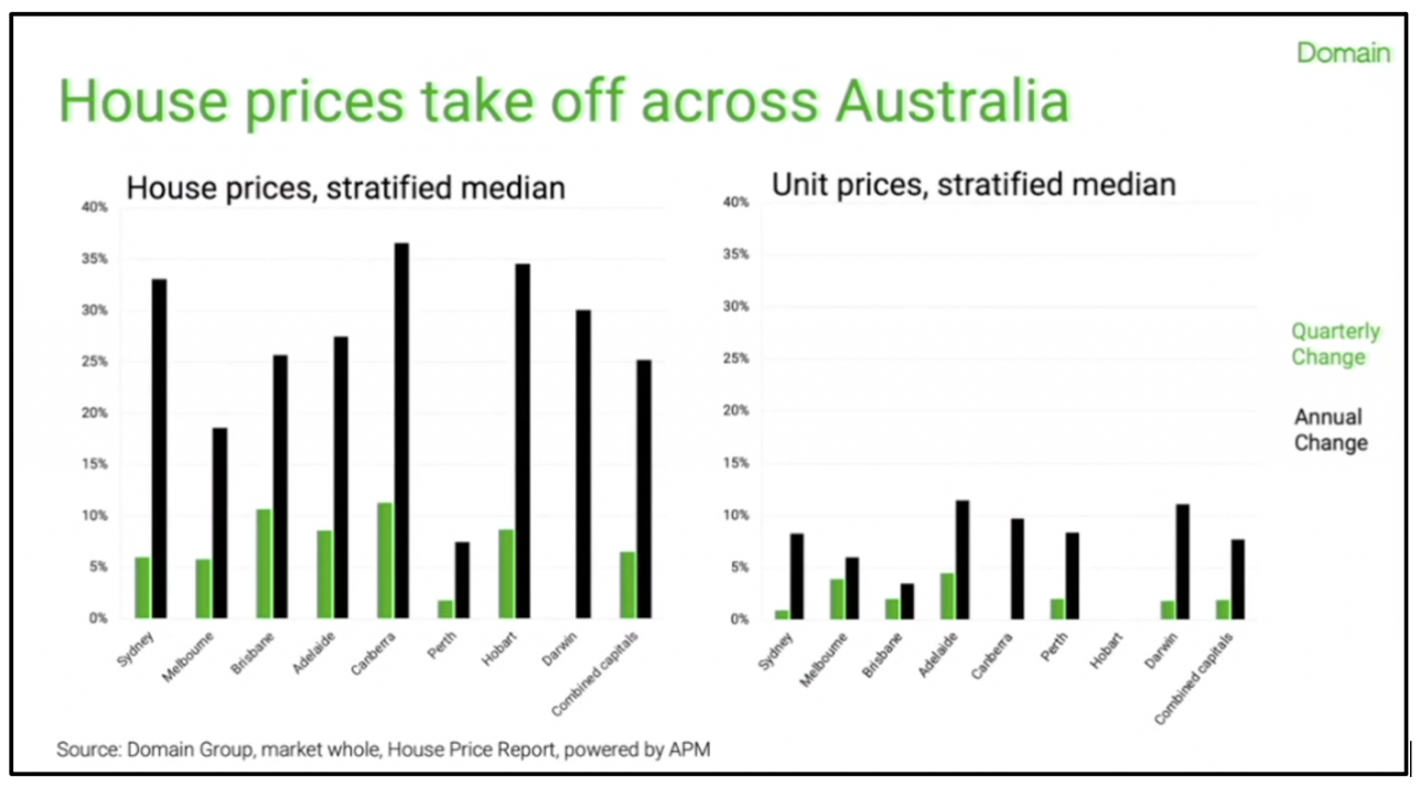 Domain House Price Report for the December 2021 quarter (released in January 2022) summarised the capital growth results across Australia for 2021. The below graph highlights the extreme growth achieved. The combined capital cites reported an annual growth of 25.5% for houses and 7.7% for units.