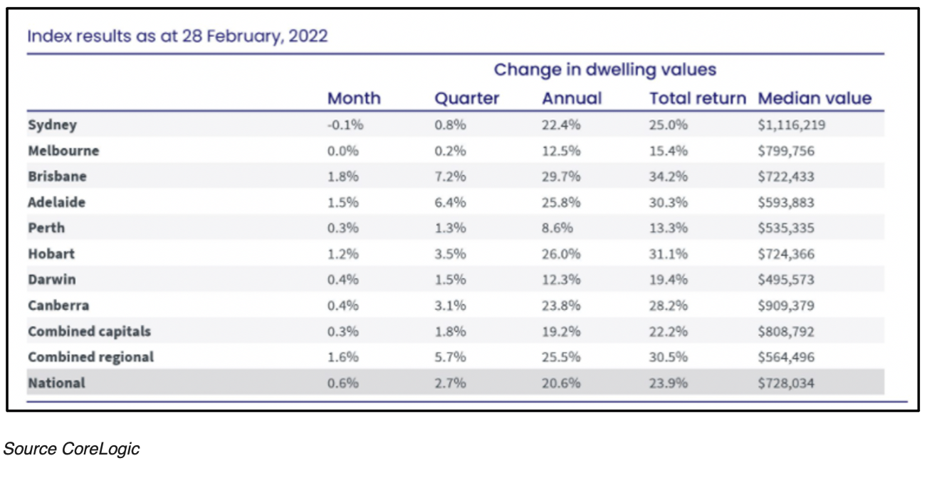 CoreLogic’s national Home Value Index (HVI) for February 2022 posted a 0.6% gain, the 17th consecutive monthly increase in the national HVI. While housing values are generally rising, the pace of growth in the national index has trended downwards since April last year. February’s growth of 0.6% marks the lowest monthly growth reading since October 2020, and is down from 1.1% in January and a peak of 2.8% in March 2021.